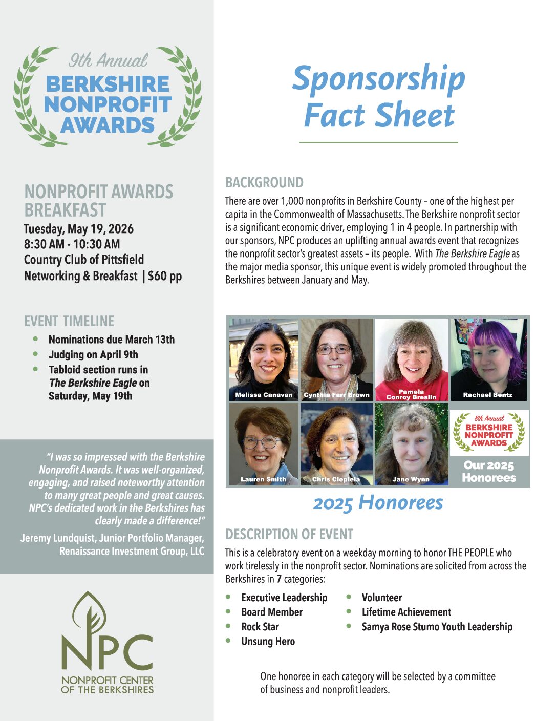 SPONSORSHIP makes this celebratory event possible for the nonprofit sector and supports NPC programs such as educational workshops and networking events for nonprofit leaders. With The Berkshire Eagle as our major media sponsor, the May event is widely publicized between February and May.